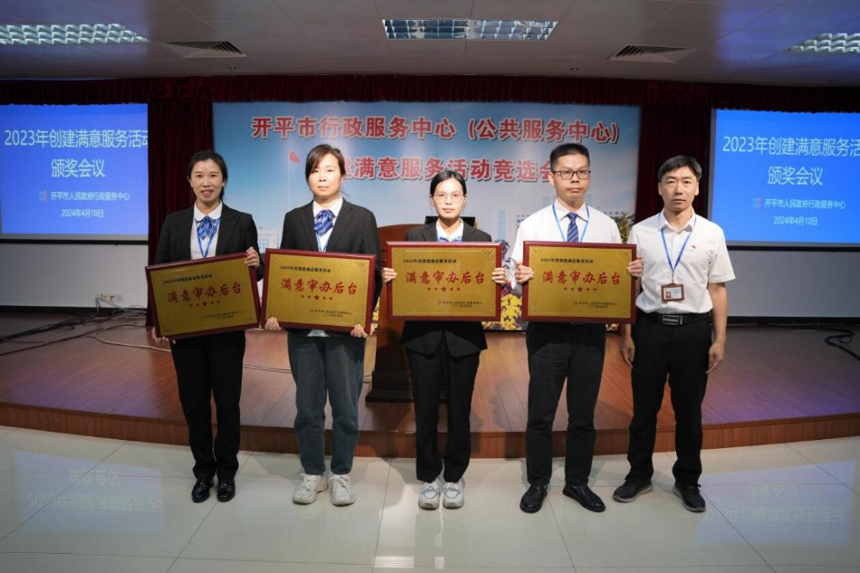 行政服务中心召开省政务服务技能大赛动员及2023年度创建满意服务活动表彰大会,市政务服务数据管理局主要领导,行政服务中心全体职工以及中心服务窗口,审办后台,服务之星代表参加了此次大会。 会议首先传达了第一届全省政务服务技能大赛江门市参赛人员选拔工作要求,详细分析广东省标杆政务服务中心指标数据,为全面推动我市政务服务能力提升,树立政务服务队伍的良好形象,打造良好营商环境添砖加瓦。 随后,进行了2023年度创建满意服务活动表彰。为加强服务窗口、审办后台、服务后勤管理,促进机关作风建设,进一步提升工作人员的政治素质和业务能力,强化责任意识、服务意识、效率意识和创先争优意识,市行政服务中心深入开展创建满意服务活动,并评选出5个“满意服务窗口”、4个“满意审办后台”、1个“满意服务后勤”以及10名“服务之星”。 市政数局党组书记、局长龚伟强同志为5个“满意服务窗口”的获奖代表颁发奖牌 市政数局党组成员、行政服务中心主任颜剑超同志为4个“满意审办后台”获奖代表颁发奖牌 市政数局副局长武胜利同志为“满意服务后勤”代表颁发奖牌 市行政服务中心副主任周建宁同志为“服务之星”获奖者颁发奖杯 市行政服务中心副主任张玉立同志为“服务之星”获奖者颁发奖杯 通过此次会议,全体职工将以先进为榜样,坚持以习近平新时代中国特色社会主义思想为指导,凝心聚力、接续奋斗,积极提升政务服务能力,在全面建设社会主义现代化国家新征程中展现我们政务服务的新担当、新作为。