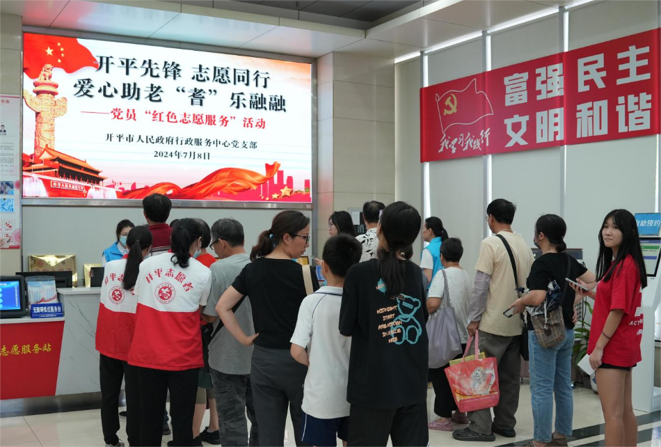 行政服务大厅一楼进行,为了活动的有序开展,党员志愿者们早早候在一旁,引导群众有序排队,并为长者们提供咨询、预约、引路等志愿服务。 活动现场,党员志愿者们聚焦老年人的政务服务需求,向长者们讲解网上预约的操作流程与变化,对长者的问题一一解答,并收集他们的意见,达到把服务送到长者心坎里的效果。 此次活动,党员们以志愿服务践行初心使命,其亮明党员身份、彰显先锋风采的实际行动,让长者们感受到老有所依、老有所安的温暖,营造了“耆”乐融融的氛围。活动得到了良好的反响,也鼓舞着党员们持续以自己的行动诠释党员担当,全力以赴推动全社会形成爱心助老的良好风尚。