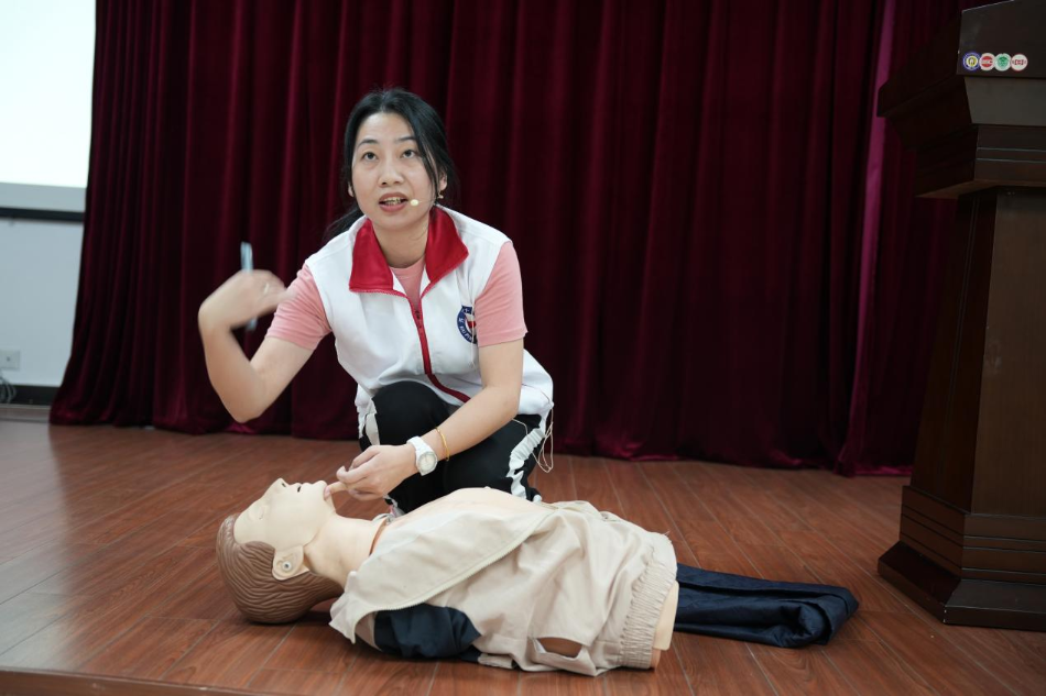 此次培训邀请红十字会讲师梁丹彤进行授课,课上进行了心肺复苏(CPR)、自动体外除颤仪(AED)的理论知识讲解以及“模拟人”心肺复苏抢救和操作演示。