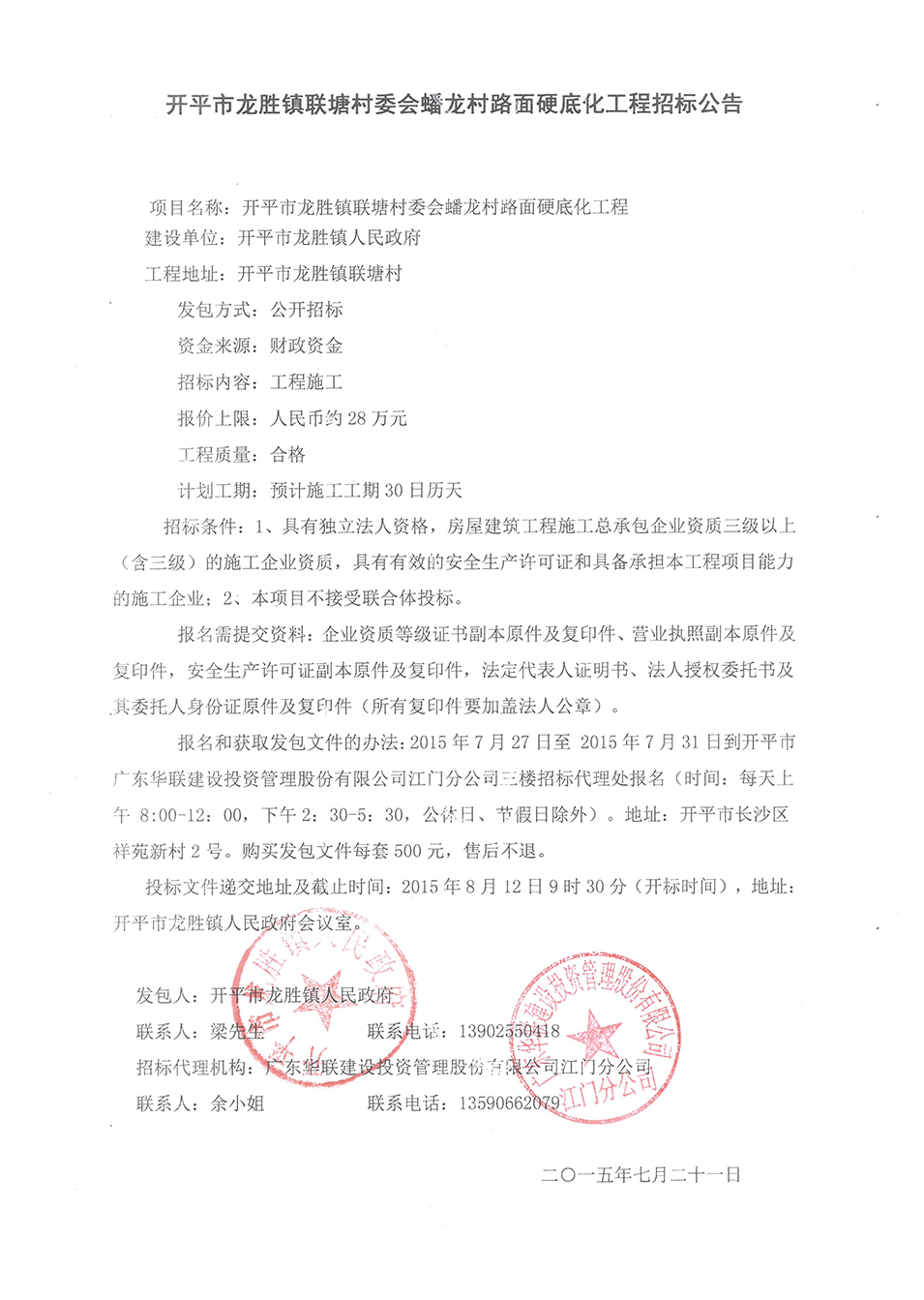 海棠直播 龙胜镇联塘村委会蟠龙村路面硬底化工程招标公告