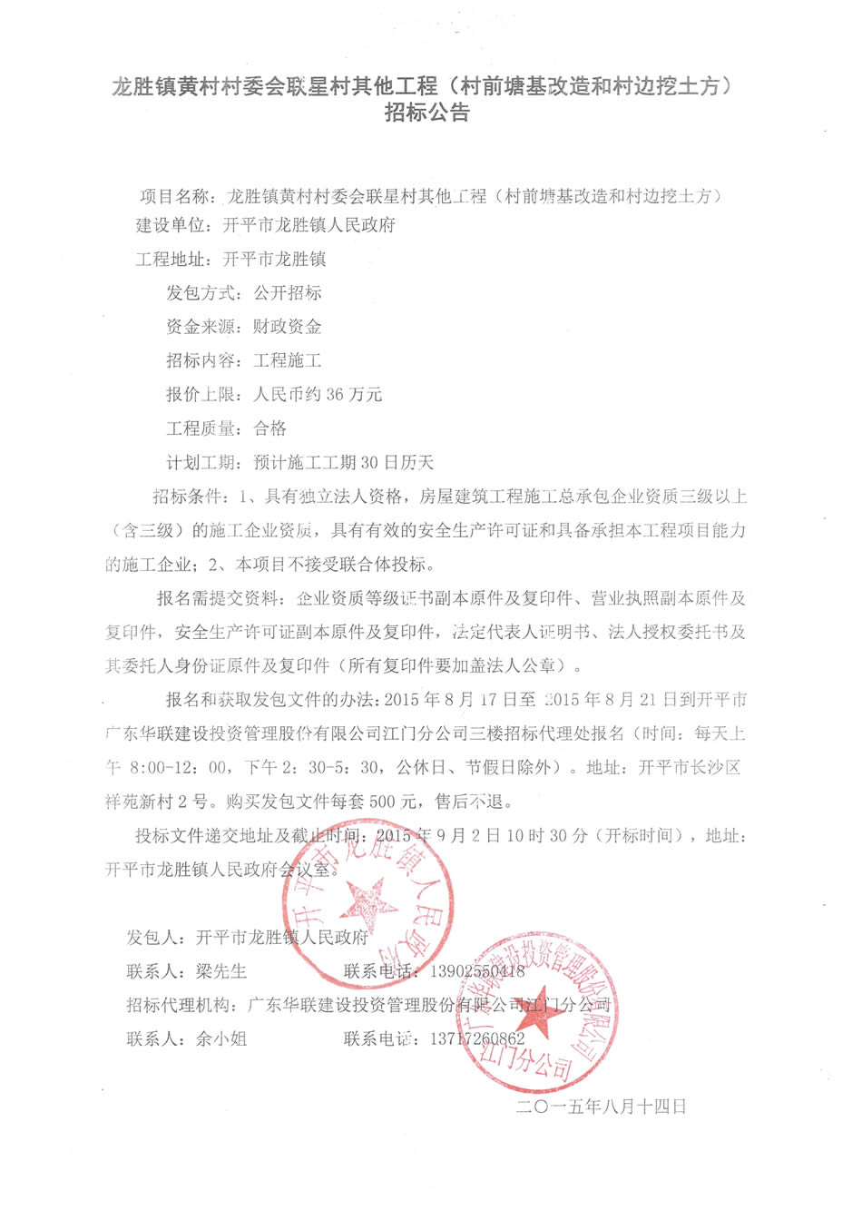 龙胜镇黄村村委会联星村其他工程(村前塘基改造和村边挖土方)招标公告
