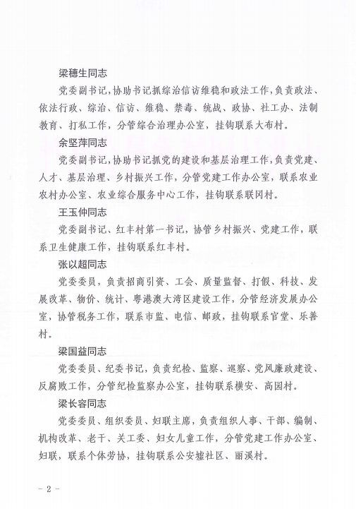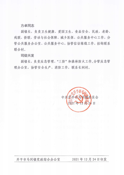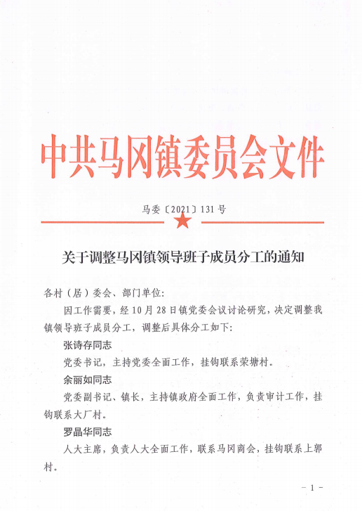 马委【2021】131号关于调整马冈镇领导班子分工的通知