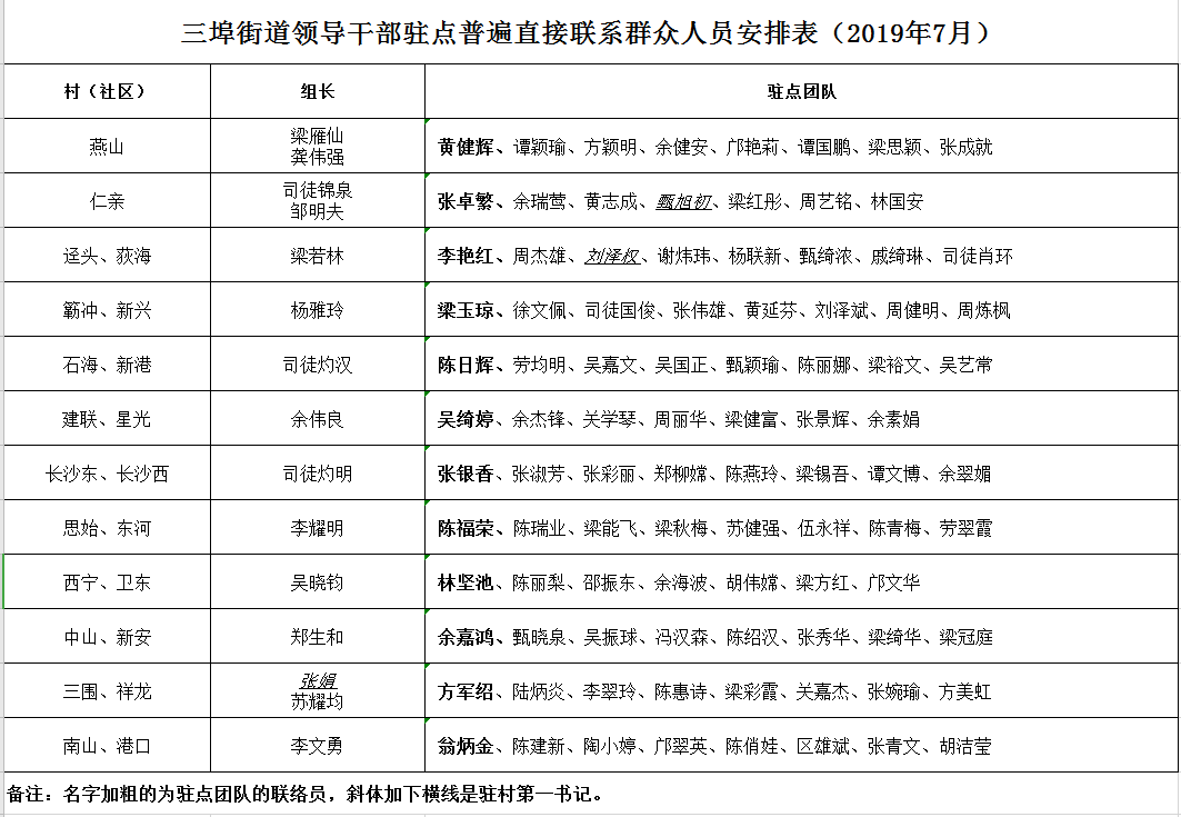 三埠街道领导干部驻点普遍直接联系群众人员安排表(2019年7月)