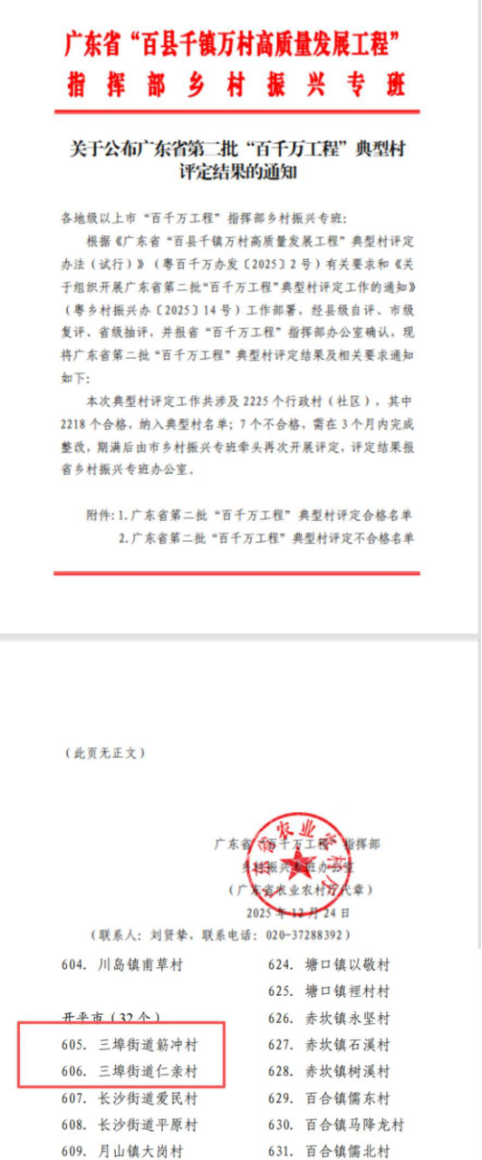 12月24日 “百千万工程”典型村建设取得新进展,街道簕冲村、仁亲村典型村建设经广东省“百千万工程”指挥部评定合格。