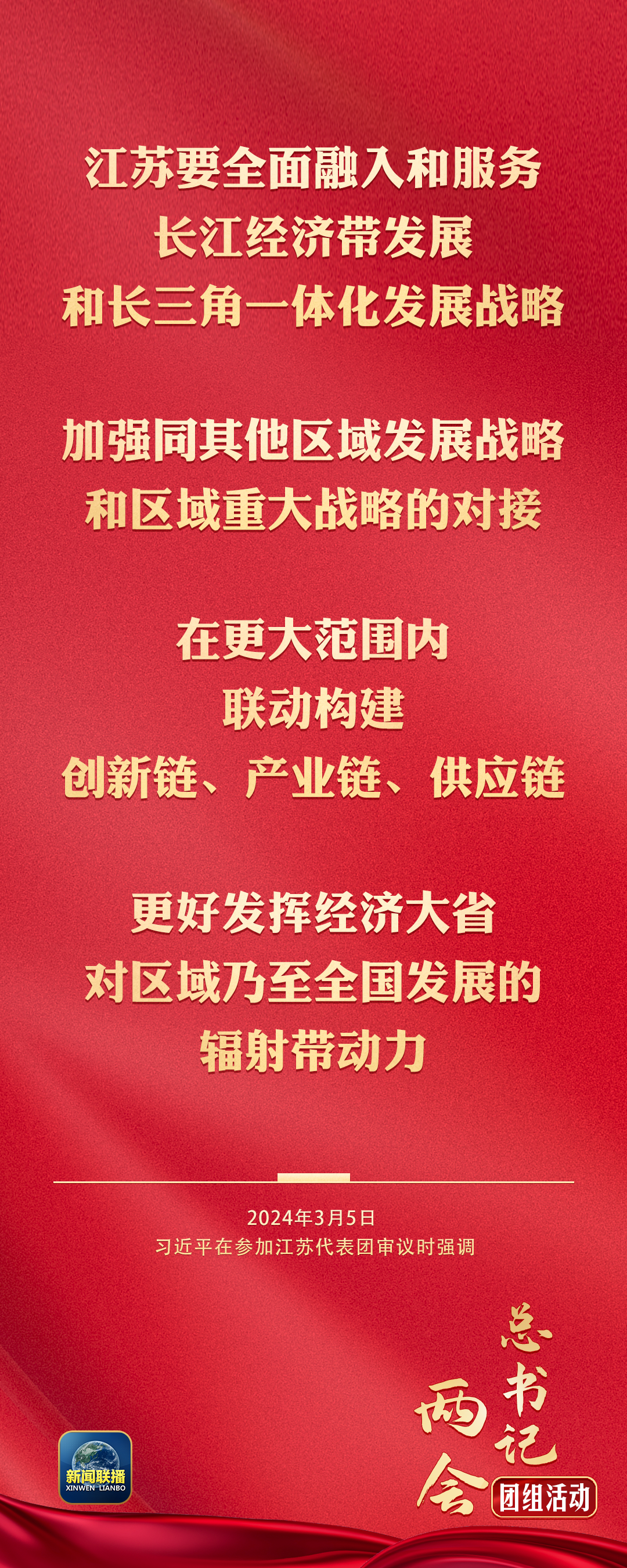 习近平强调,党的十八大以来,我们实施了一系列区域协调发展战略、区域重大战略、主体功能区战略等,为构建新发展格局、推动高质量发展发挥了重要支撑作用。江苏要全面融入和服务长江经济带发展和长三角一体化发展战略,加强同其他区域发展战略和区域重大战略的对接,在更大范围内联动构建创新链、产业链、供应链,更好发挥经济大省对区域乃至全国发展的辐射带动力。