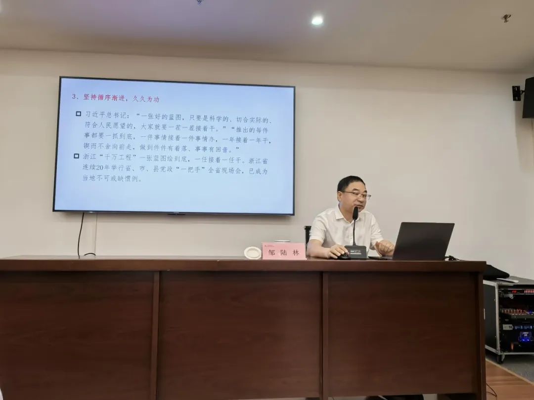 本次培训班邀请了江门市委党校邹陆林教授作《深入实施“百千万工程”建设宜居宜业和美乡村》专题授课。邹教授结合浙江“千万工程”优秀发展经验,提出建设宜居宜业和美乡村重在观念,坚持因地制宜,发掘乡村特色,进行科学规划,创新原生态村居风貌和现代元素结合方式,并就江门特色农产品和特色风貌提出发展想法,激励干部多思、多想、多干,走出属于自己的高质量发展道路。