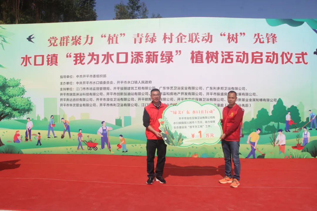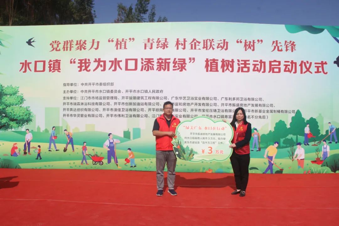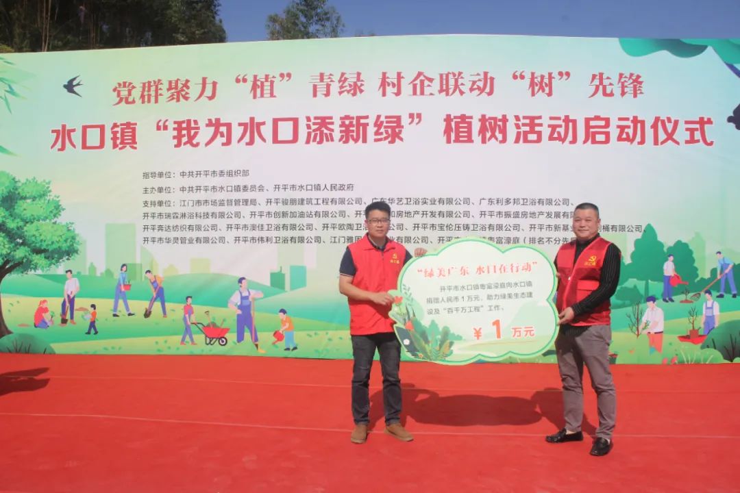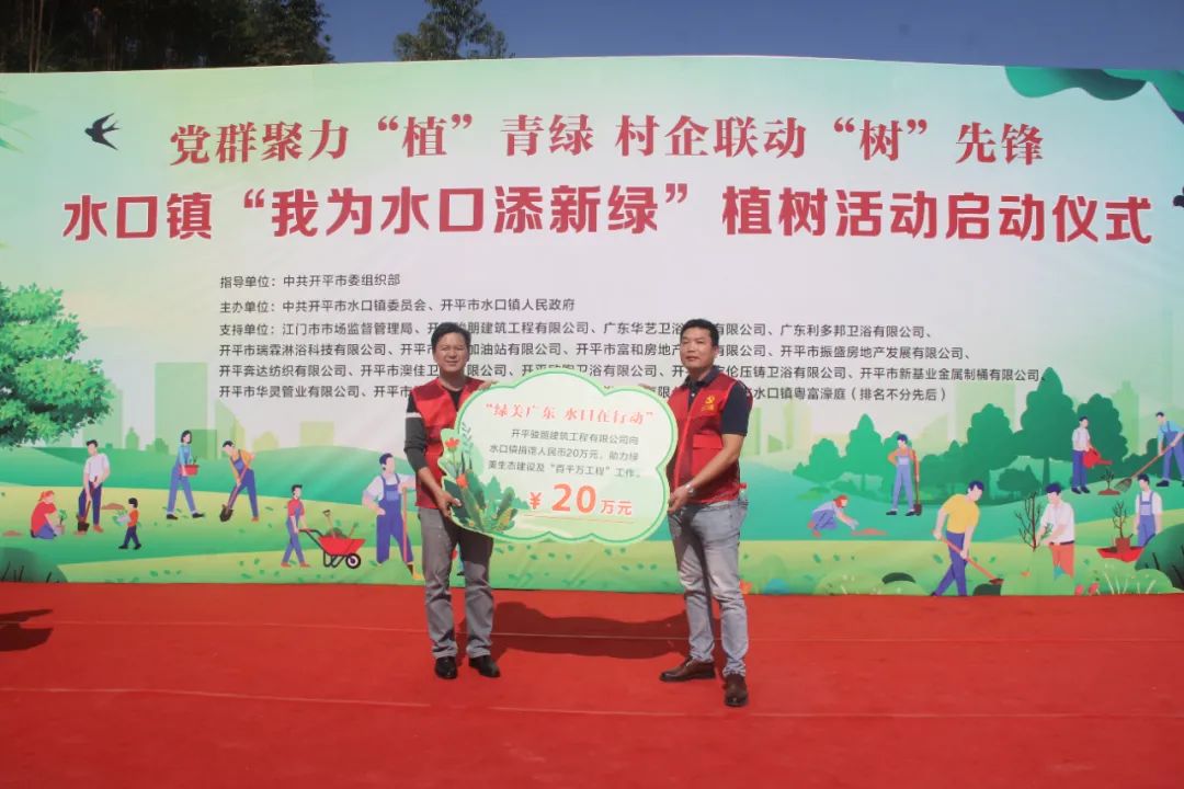 仪式上,结对帮扶单位江门市市场监督管理局和16家爱心企业向水口镇人民政府捐赠人民币共计75.097万元,定向用于水口镇乡村绿化项目。