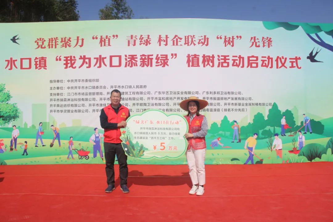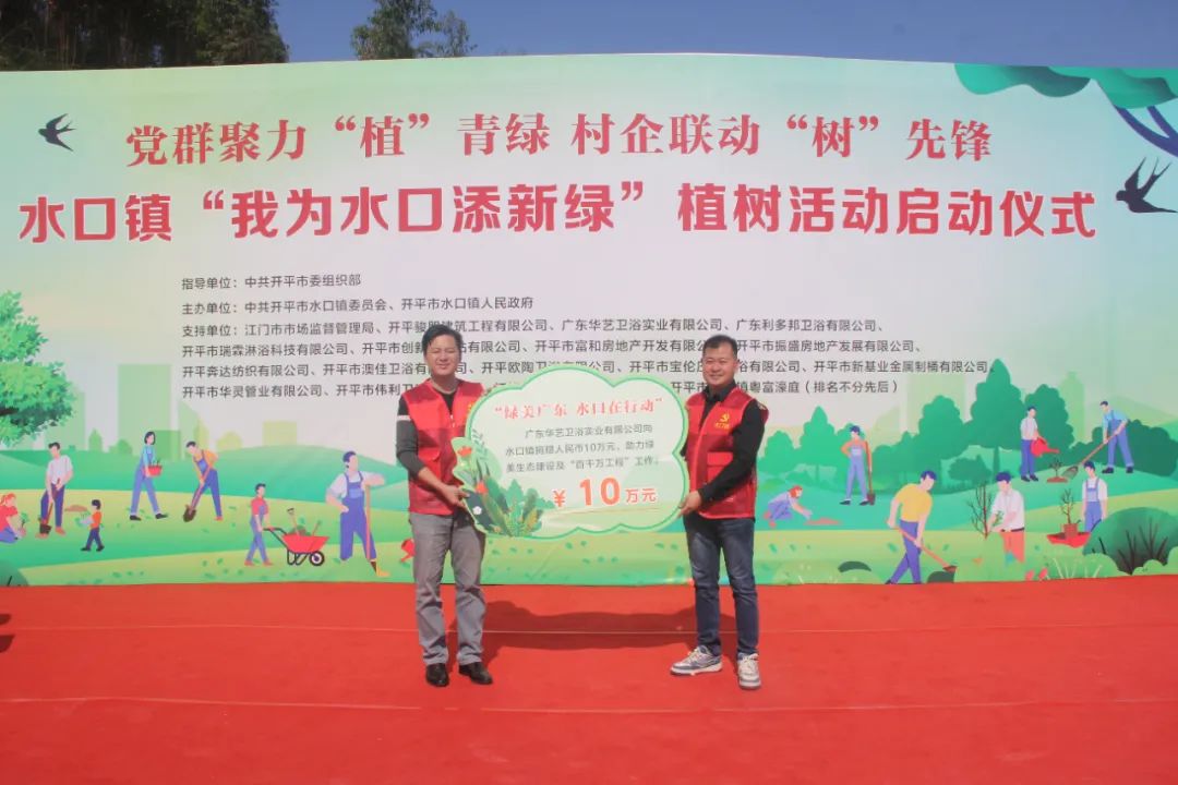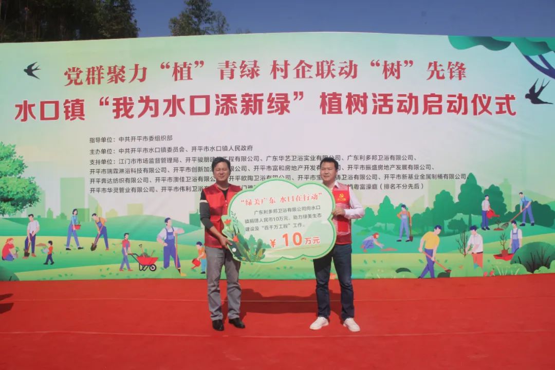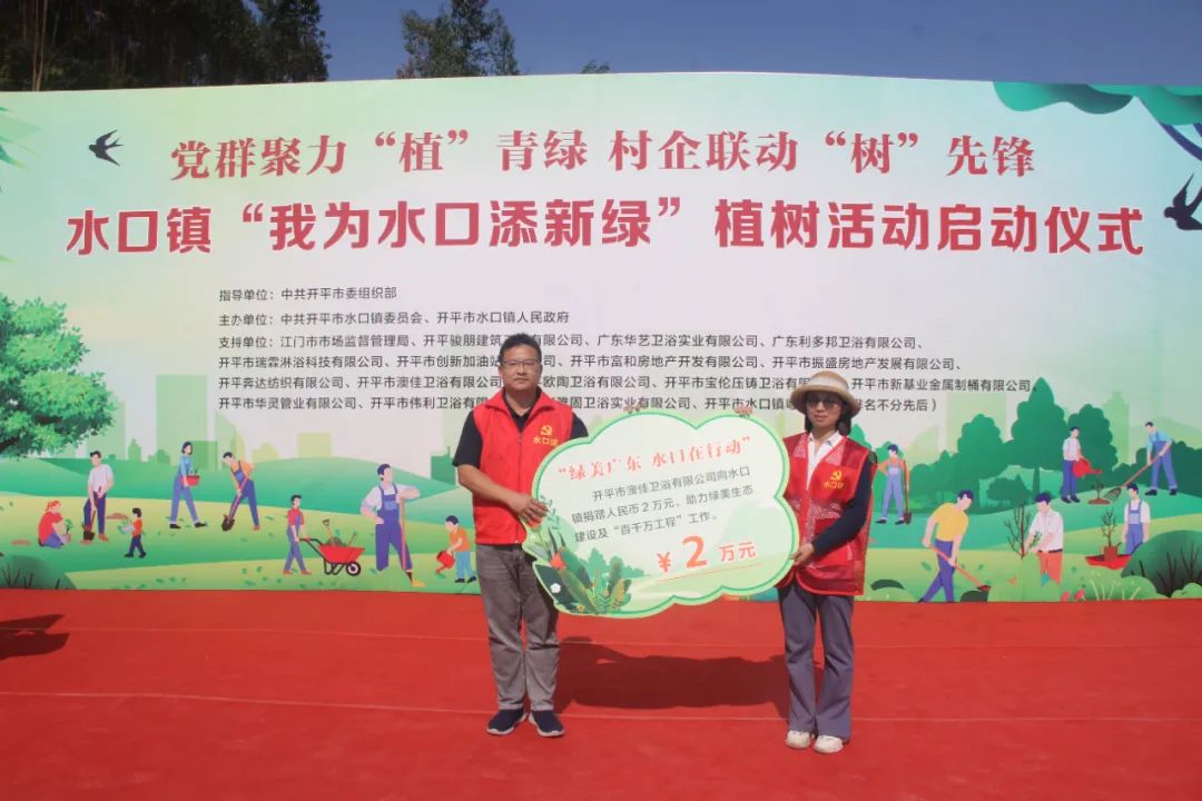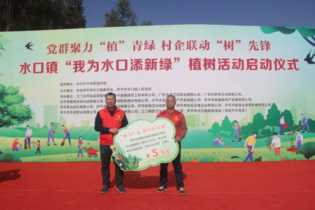 仪式上,结对帮扶单位江门市市场监督管理局和16家爱心企业向水口镇人民政府捐赠人民币共计75.097万元,定向用于水口镇乡村绿化项目。