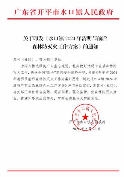 镇党委、政府高度重视,及时召开清明节前森林防灭火专题会议,印发《水口镇2024年清明节前后森林防灭火工作方案》,对清明节期间森林防灭火和安全生产工作进行安排部署并提出具体要求,严格落实领导带班和24小时专人值班制度,做到“山有人管、林有人护、火有人防、责有人担”。