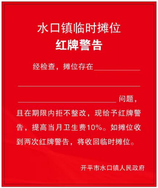 水口镇执法办通过日常检查、群众举报等途径,对存在占道经营、乱丢垃圾、卫生质量不达标、产生油烟或噪音污染等问题的临时摊位,当即下发黄牌警告,责令限期整改;逾期不整改或再次检查发现问题的,给予红牌警告,并提高当月卫生费10%;收到两次红牌的,将取消临时摊位经营资格,并列入管理领域违法失信行为“重点关注名单”。