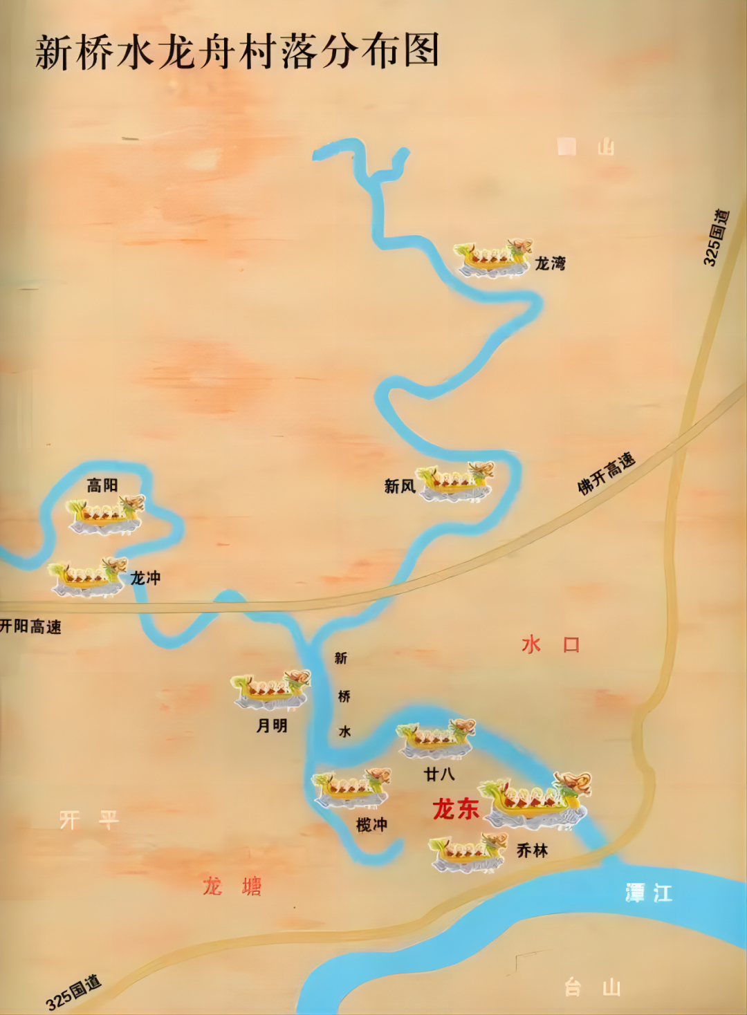 一是水口龙东龙舟。从地图上看,古老的潭江支流——新桥水河道曲折,拱抱龙塘大地,形成“二龙戏珠”的格局,古人便将此地命名“龙塘”。水口镇龙东村委会位于开平水口龙塘东部,正所谓“靠水吃水”,龙塘人世代以水为生,投身于“行船”工作,培育了龙东男子自幼便在水上活动的习性,也让龙塘人民形成产生了对“龙”的崇拜。为祈求风调雨顺、国泰民安,也为了向全族人展示本村的团结和实力,“扒龙舟”风尚兴起,并逐渐发展成为最重要的民俗活动之一。