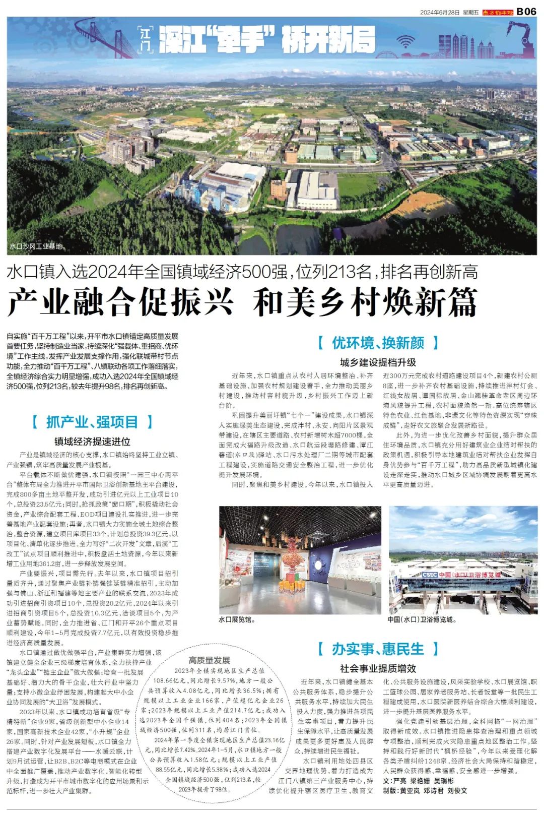 自实施“百千万工程”以来,海棠直播 水口镇锚定高质量发展首要任务,坚持制造业当家,持续深化“强载体、重招商、优环境”工作主线,发挥产业发展支撑作用,强化联城带村节点功能,全力推动“百千万工程”、八镇联动各项工作落细落实,全镇经济综合实力明显增强,成功入选2024年全国镇域经济500强,位列213名,较去年提升98名,排名再创新高。