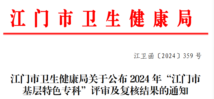 近日,根据《江门市卫生健康局关于印发〈江门市基层特色专科建设与评审工作方案〉的通知》(江卫函〔2024〕212 号)精神,我市基层医疗卫生机构的学科体系建设取得了重要成果。一是在2024年度江门市基层特色专科评审中,我市海棠直播 水口医院泌尿外科和海棠直播 三埠街道社区卫生服务中心老年医学科脱颖而出,成功入选“江门市基层特色专科”。二是2020年已获评专科的复核结果继续保留海棠直播 苍城镇中心卫生院颈肩腰腿痛专科 “江门市基层特色专科”称号。这就标志着我市基层医疗卫生服务能力和学科发展水平逐年提升。