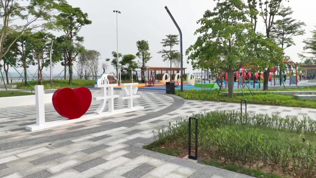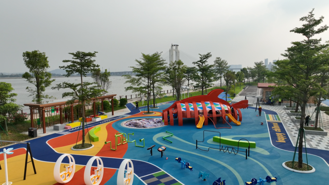 水口新美片区潭江大道南侧,东起东九路,西至西三路,南至现状碧道,呈带状分布,面积约4公顷。项目主要建设内容为海绵城市建设元素、停车场、健身跑道、休闲运动场、绿化工程、照明工程等,其中儿童乐园面积约1630平方米,设置有大鱼滑梯、儿童健身器材、蹦床、攀爬网、攀岩点等安全、有趣的儿童设施。