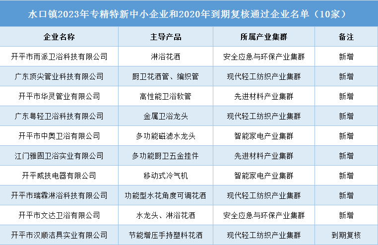 1月8日,广东省工业和信息化厅公布2023年专精特新中小企业和2020年到期复核通过企业名单,水口镇申请专精特新中小企业认定(含到期复核1家)企业共10家,全部通过认定审核。截至目前,水口镇拥有省级专精特新中小企业企业24家(水暖卫浴19家),数量居全市第一。