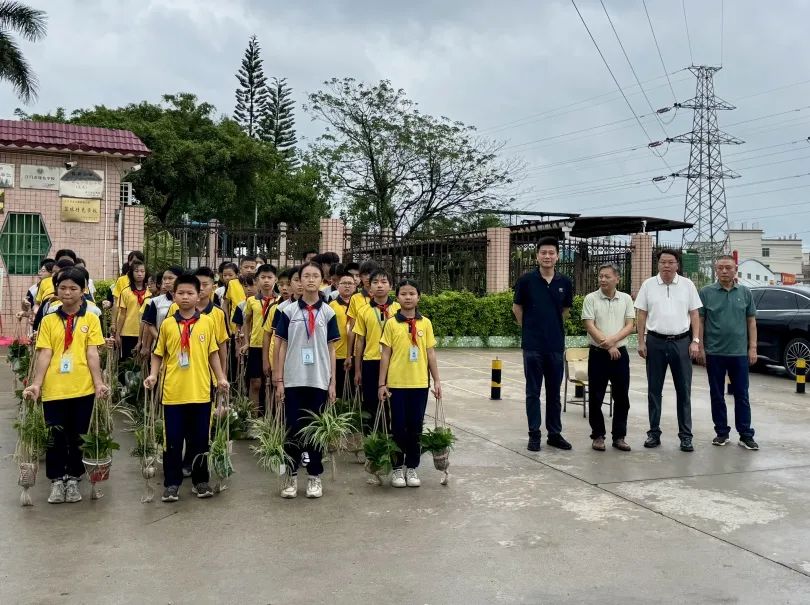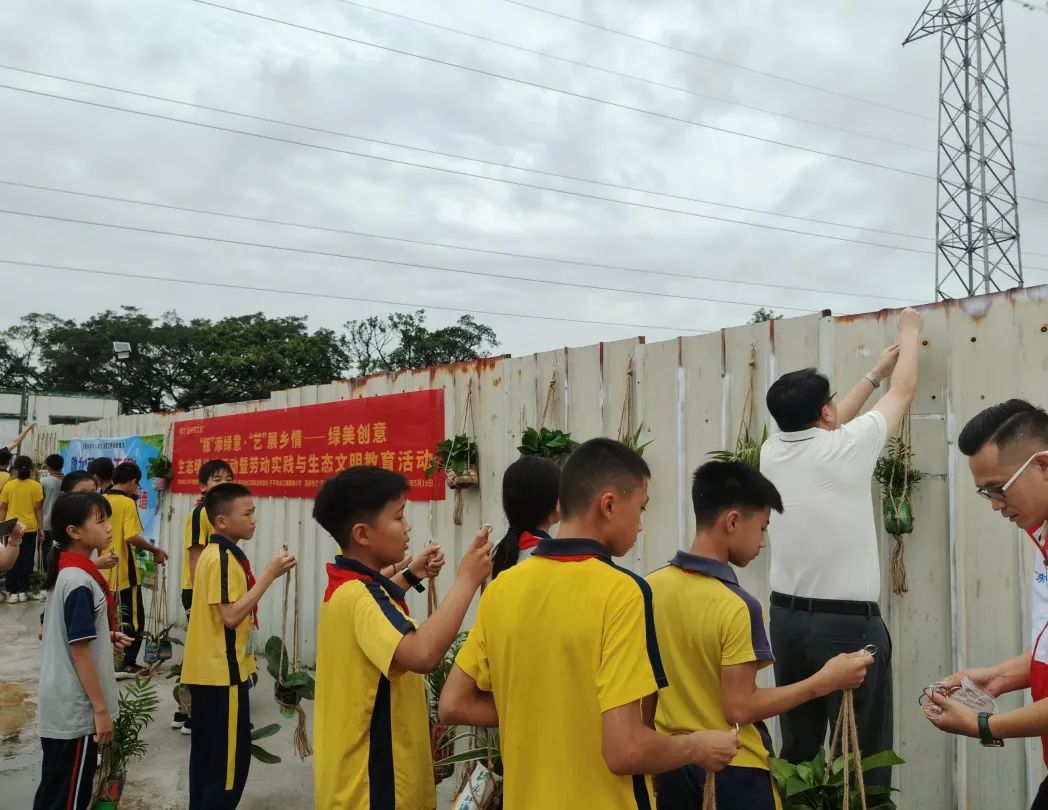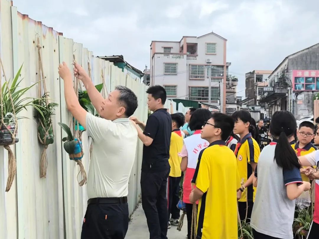 活动当日,在庄严的《绿美行动倡议书》宣读声中,共建行动正式启动。师生分组协作,将创意花瓶通过挂钩、麻绳等工具有序悬挂至学学校大门前厂房铁皮外墙及周边指定公共区域。