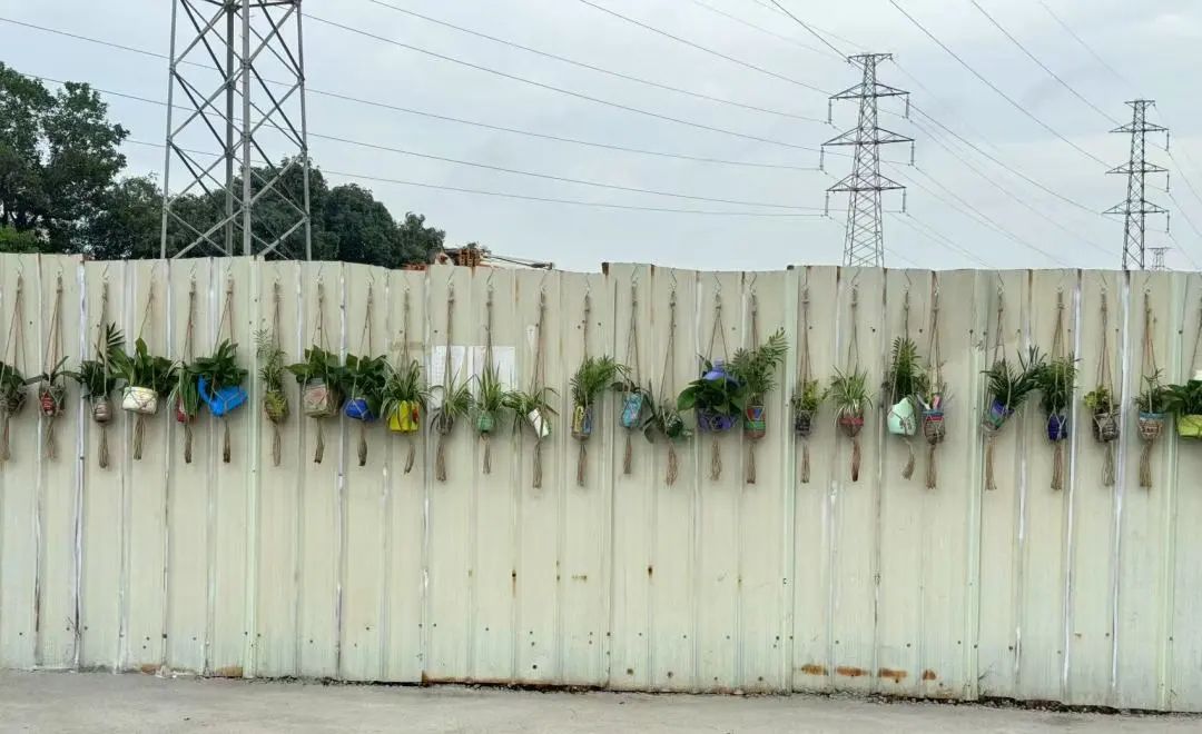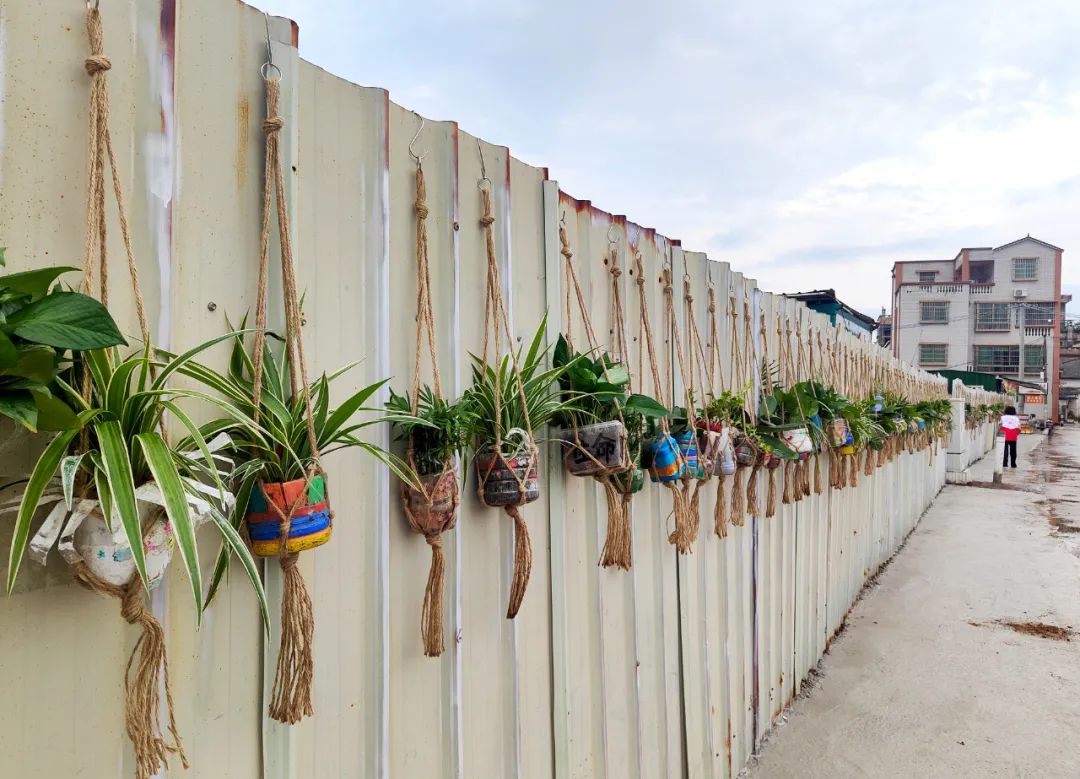 一个个承载着奇思妙想的花瓶里,绿植蓬勃生长,与乡村风貌相映成趣,原本单调的铁皮墙摇身变为 “会呼吸的艺术长廊”。