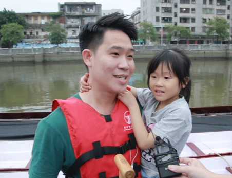 龙舟队队员何伟潮:“我老婆和女儿都喜欢龙舟运动,特别是我的女儿,年龄比较小,我觉得从小应该带她来体验下家里的传统龙舟的氛围,端午节期间,我们夫妻还会一起去划龙舟。”