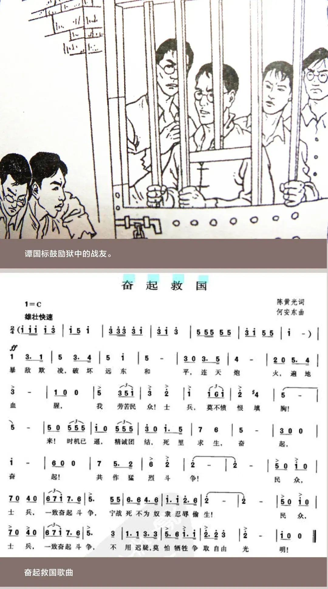 虽身陷囹圄,谭国标仍然斗志昂扬。在狱中,谭国标对朋友说:“革命总是有牺牲的,你出狱后继续斗争的任务更艰巨。”此外,谭国标向看守人员做思想工作,并利用叶傲霜探视的机会,把写着《奋起救国》和《万里寻兄》(电影《野草闲花》主题曲)歌词和诗句的纸条,传递给女牢的战友,以此鼓励不要放弃,坚持斗争。