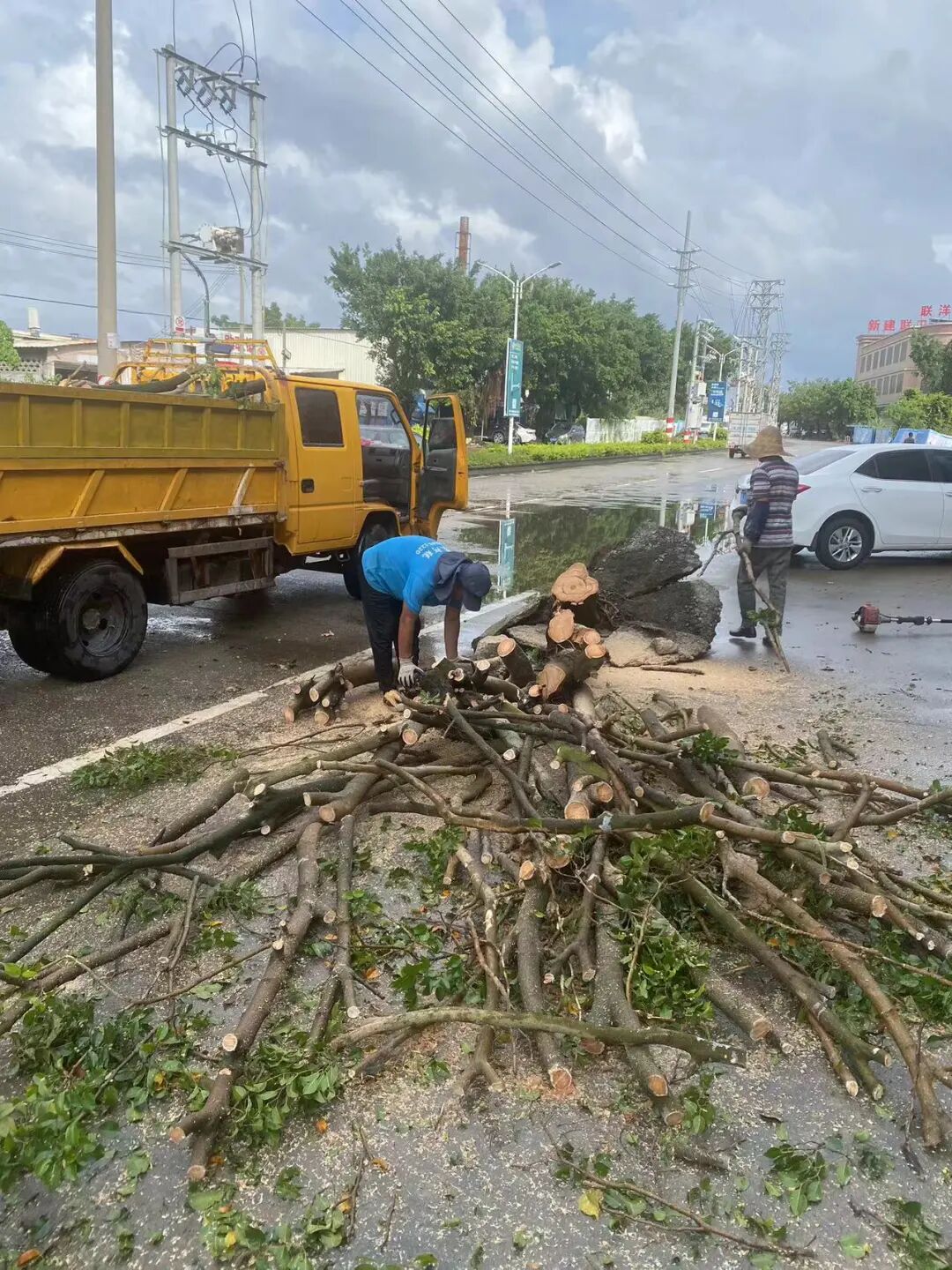 水口镇综合行政执法队冲锋在前,清理倒地树木,搬运破损设施,迅速打通道路。
