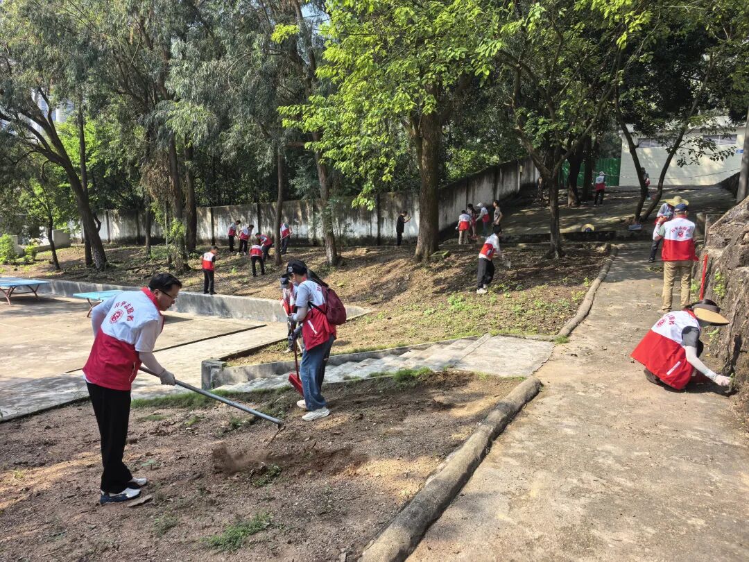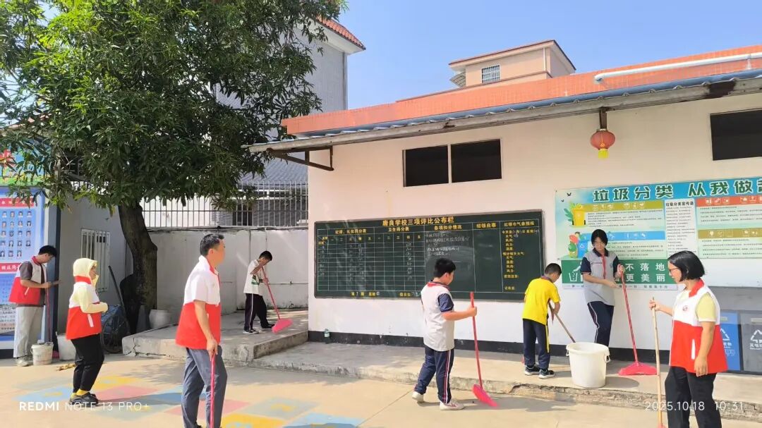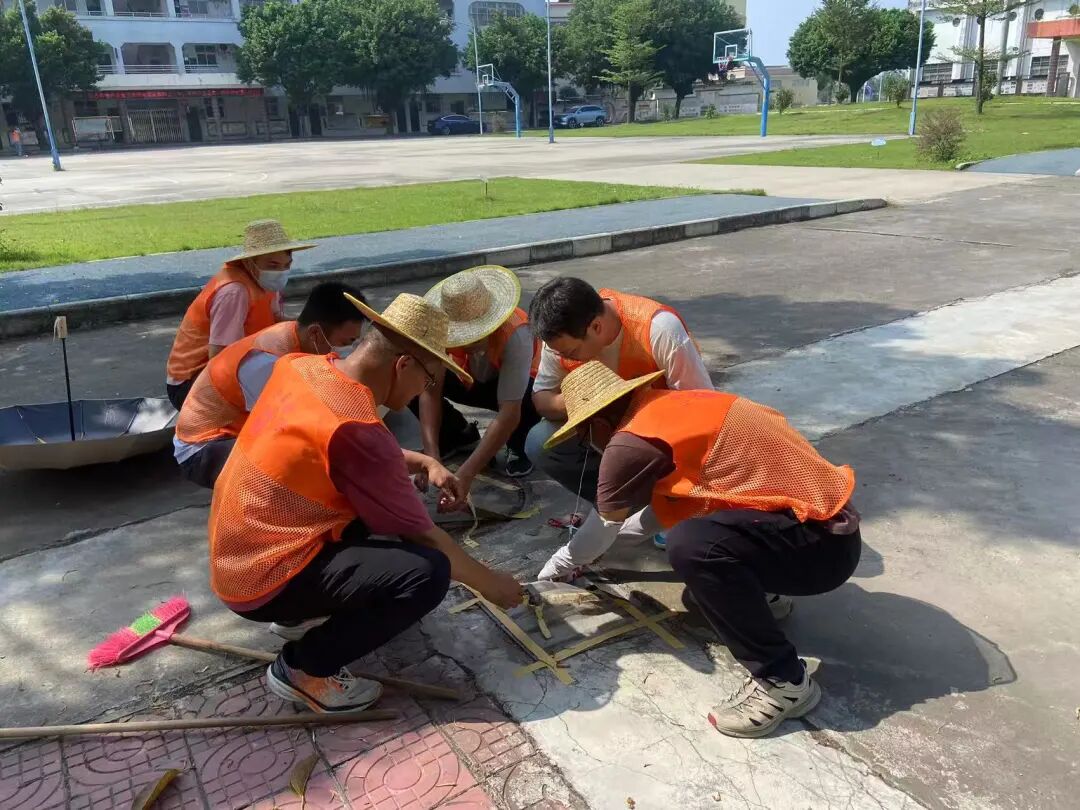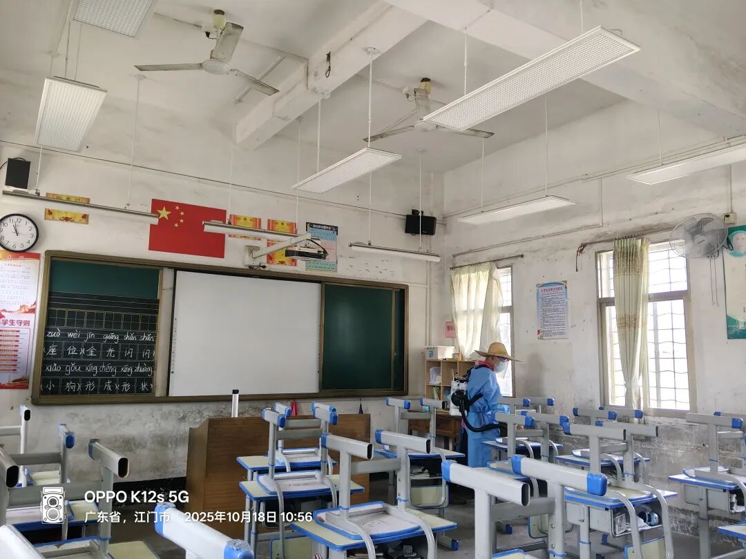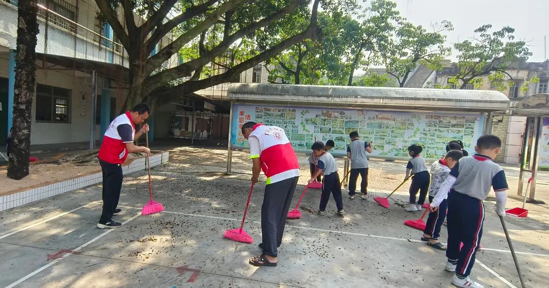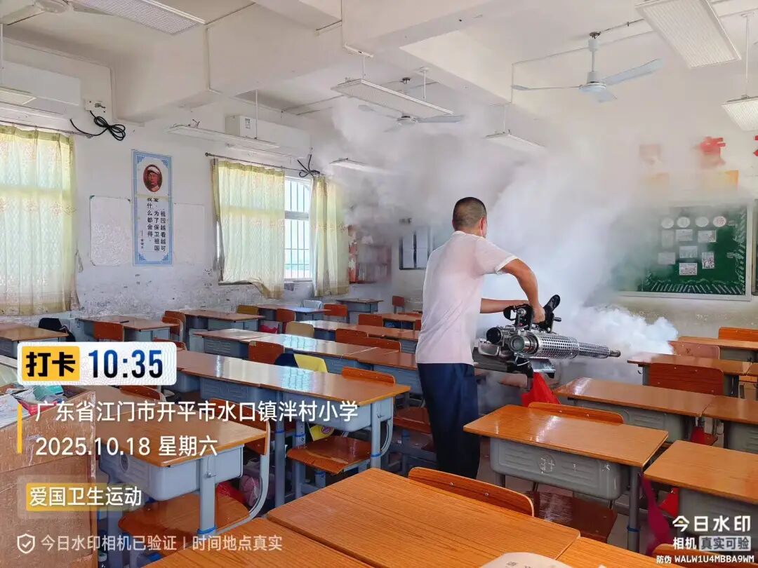 誓师仪式结束后,各校迅速转入“两清一灭”实战环节,校园内外处处是忙碌身影:水口镇第一小学师生手持锄头、铁锹,清理绿化带杂草与边角空地杂物;第三小学组建“清扫、清洁、后勤”三组,地毯式排查积水区、擦拭课桌、更换下水道纱网;自强分教点清运垃圾30余袋,对800多平方米公共区域开展消杀;泮村小学分清理、清运、消杀组,疏通沟渠、喷洒药物,降低病媒生物密度;致和小学新风分教点师生清理卫生死角,后勤部门跟进专业消杀;沙冈小学联合专业人员,重点对下水道、垃圾桶周边等区域科学灭杀,确保“无死角、无遗漏”。