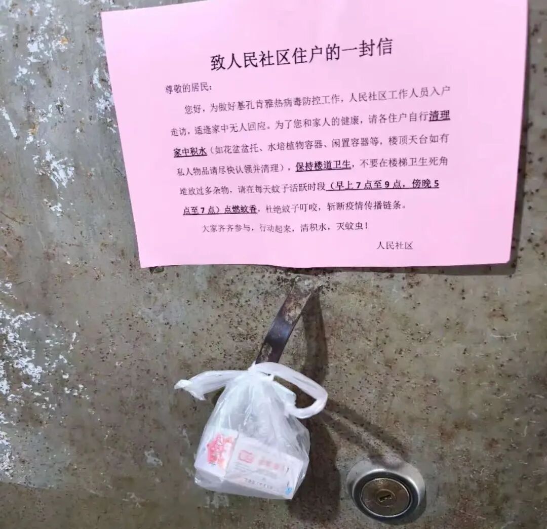 人民社区是辖区中心区域,居民以外出工作人员和上班族居多,白天时间许多家庭都没人在家,若等到晚上再派发蚊香则错过灭蚊的“黄金时间”。为此,社区干部精心准备了“防蚊家庭健康包”,内含灭蚊片、蚊香、防蚊液以及宣传册子、使用说明等物品,如在扫楼入户期间,该户无人响应,社区干部就把“防蚊家庭健康包”挂在门把手上,并附上通知书,号召住户齐齐参与点灭蚊片、蚊香活动。人民社区负责同志表示:“行动效果非常好,一些住户下班回家之后,看到门上挂着的‘防蚊家庭健康包’,主动致电给居委会询问,并表示将配合社区工作。”截至目前,人民社区已累计制作并发放健康包200多个,形成了干群同心、群防群治的生动局面。