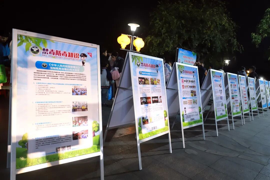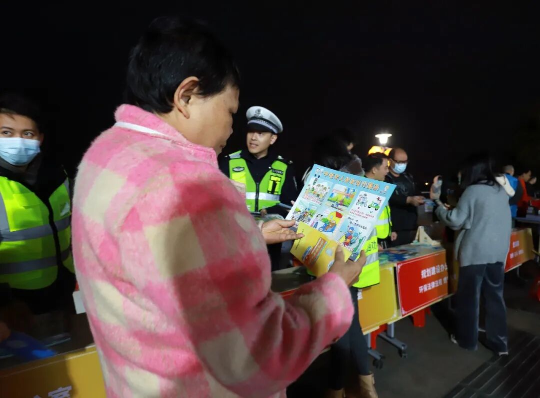 华灯初上,“普法夜市”开摊。各普法摊位连接铺开,前来赶集的群众熙熙攘攘、热闹非凡。“交通安全宣传摊位前”,交通规则等咨询接连不断;“禁毒摊位”的社工则用仿真毒品模型讲解常见毒品类型和危害;“反诈摊位”“烟草法治摊位”等摊位同样深受欢迎,各领域工作人员面对面为大家提供精准的法律支持。