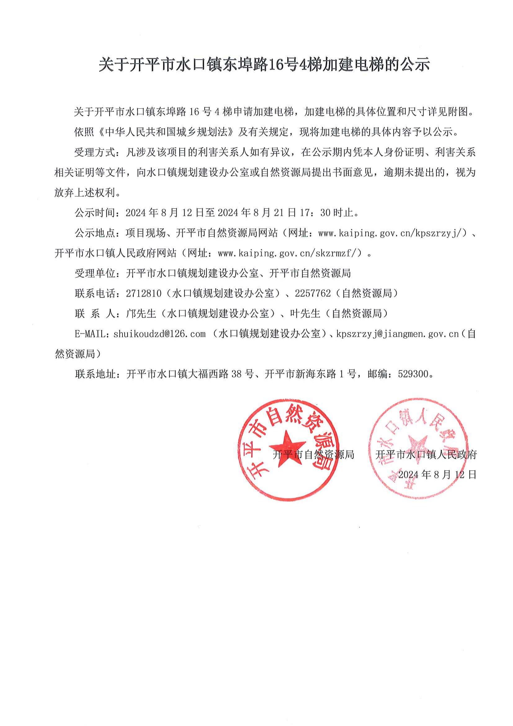 关于海棠直播 水口镇东埠路16号4梯申请加建电梯,加建电梯的具体位置和尺寸详见附图。依照《中华人民共和国城乡规划法》及有关规定,现将加建电梯的具体内容予以公示。受理方式:凡涉及该项目的利害关系人如有异议,在公示期内凭本人身份证明、利害关系相关证明等文件,向水口镇规划建设办公室或自然资源局提出书面意见,逾期未提出的,视为放弃上述权利。