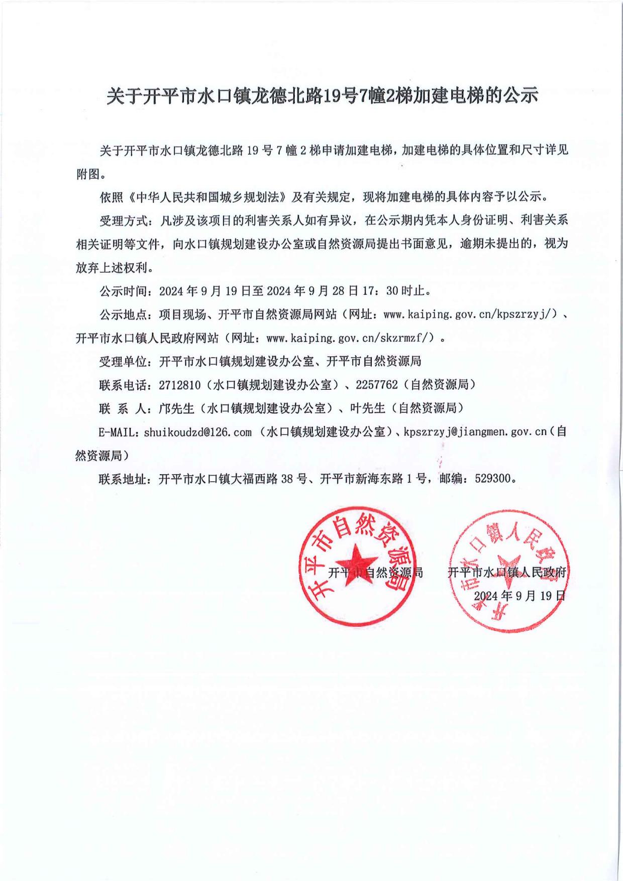 关于海棠直播 水口镇龙德北路19号7幢2梯加建电梯的公示