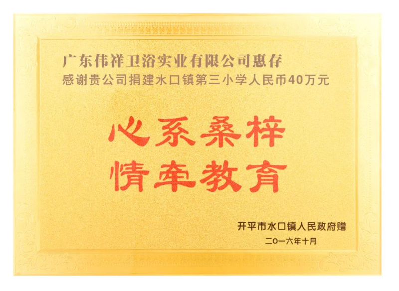 伟祥卫浴在自身发展的同时,始终自觉担当、积极履责,以大爱之心投身公益、回馈社会,以点滴之爱汇聚暖流、服务群众,在脱贫攻坚、乡村振兴、慈善募捐、疫情防控等方面做出了积极贡献,展现出了高度的责任担当与家国情怀。