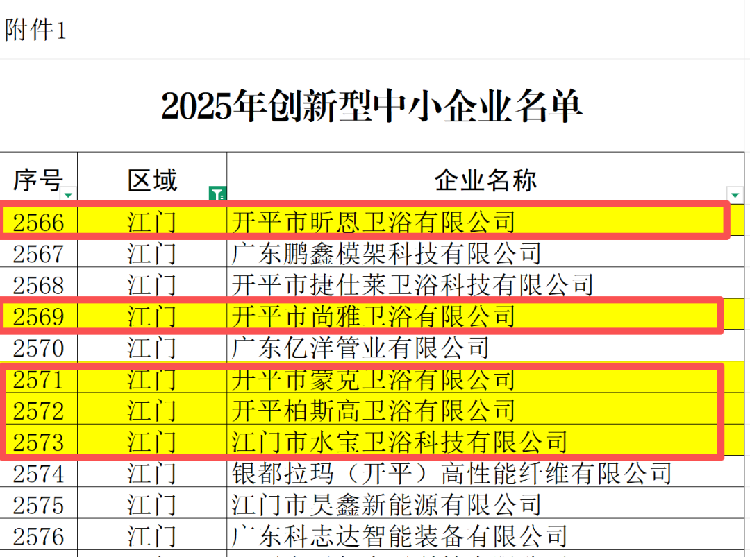 日前,广东省工业和信息化厅公布了2025年创新型中小企业和通过复核的创新型中小企业名单,水口镇5家企业新入选省创新型中小企业名单,分别为:海棠直播 昕恩卫浴有限公司、海棠直播 尚雅卫浴有限公司、海棠直播 蒙克卫浴有限公司、开平柏斯高卫浴有限公司、江门市水宝卫浴科技有限公司。