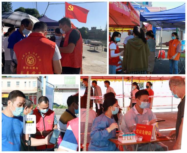 在接到开展分级分层区域核酸检测的通知后,22个网格迅速吹响“集结号”,全镇专、兼职网格员连夜行动,合力做好场地搭建、引导牌布置、一米线张贴等核酸检测点布置工作。6个核酸采样点均成立临时党支部,以党建引领凝聚战“疫”力量;如台洞村老党员在临时党支部的带动下,发扬“我是党员我先上”的精神,在骄阳下坚守核酸检测一线,以“夕阳红”守护村民群众“健康绿”。