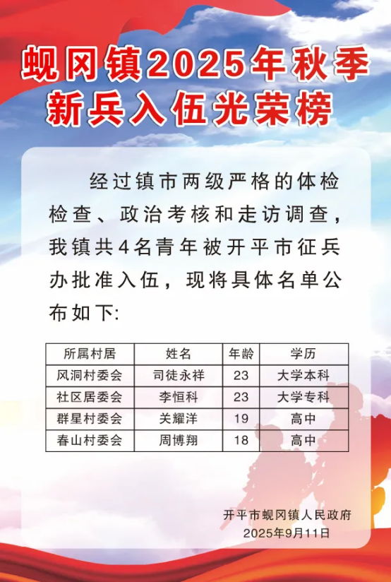 “国无防不立,民无兵不安。”自征兵工作启动以来,蚬冈镇武装部及相关部门严格遵照上级部署,精心组织、密切配合,坚持高标准、严要求,确保了征兵各个环节公平、公正、公开、透明。四位青年的脱颖而出,是蚬冈镇国防动员工作成效的一次集中体现,也是蚬冈镇深厚拥军优属传统和全民国防意识不断增强的生动见证。