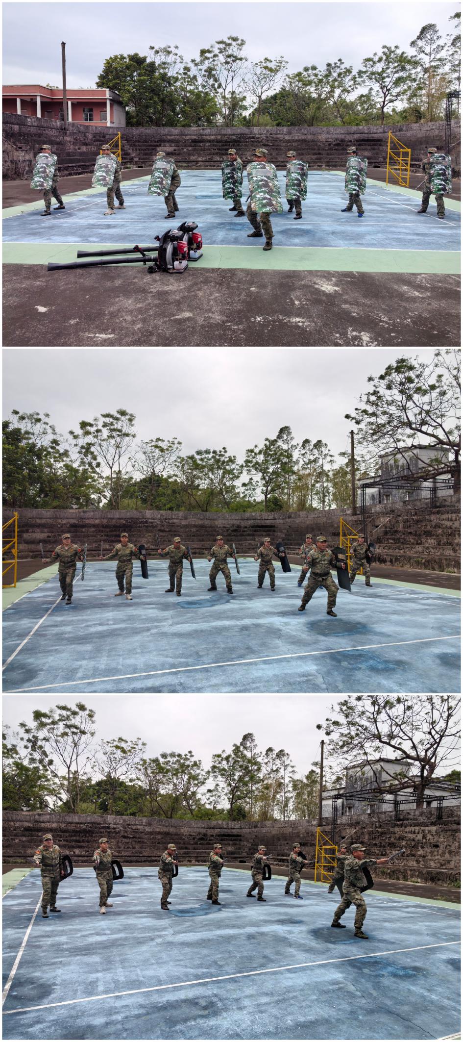 集训还设置了反恐维稳课目,重点进行了警棍盾牌操练。队员们手持警棍盾牌,精神高度集中,随着口令,反复练习格挡、劈击、戳击、防护等基本动作,铿锵有力的撞击声与呐喊声交织,展现了民兵队伍在维护社会稳定方面的坚强决心和处置能力。