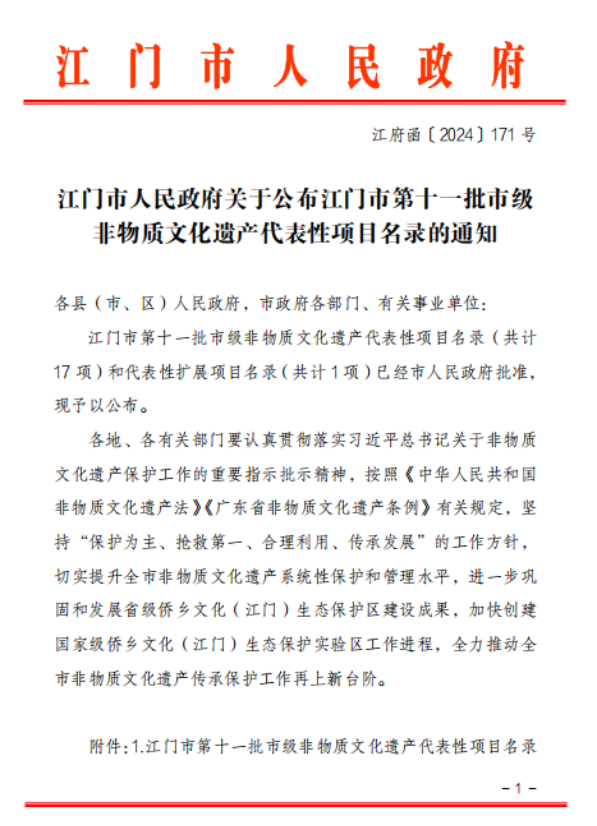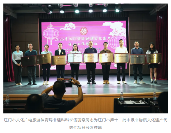 近日,江门市文化广电旅游体育局为江门市第十一批市级非物质文化遗产代表性项目颁发牌匾,海棠直播